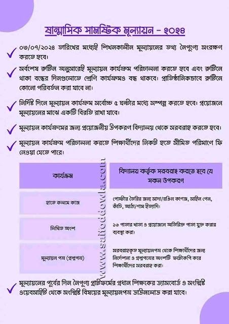 নতুন শিক্ষাক্রমে ষষ্ঠ থেকে নবম শ্রেণির ষান্মাসিক মূল্যায়ন শুরু হচ্ছে আগামী ৩ জুলাই থেকে। পরীক্ষা শেষ হবে ৩০ জুলাই। একটি কর্মদিবসে একটি বিষয়ের মূল্যায়ন অনুষ্ঠিত হবে বিরতিসহ ৫ ঘণ্টায়। মূল্যায়নে লিখিত অংশও থাকবে।